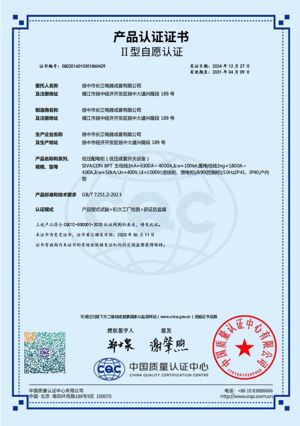 SIVACON8PT6300A-4000A低壓配電柜(低壓成套開關設備)產品認證證書